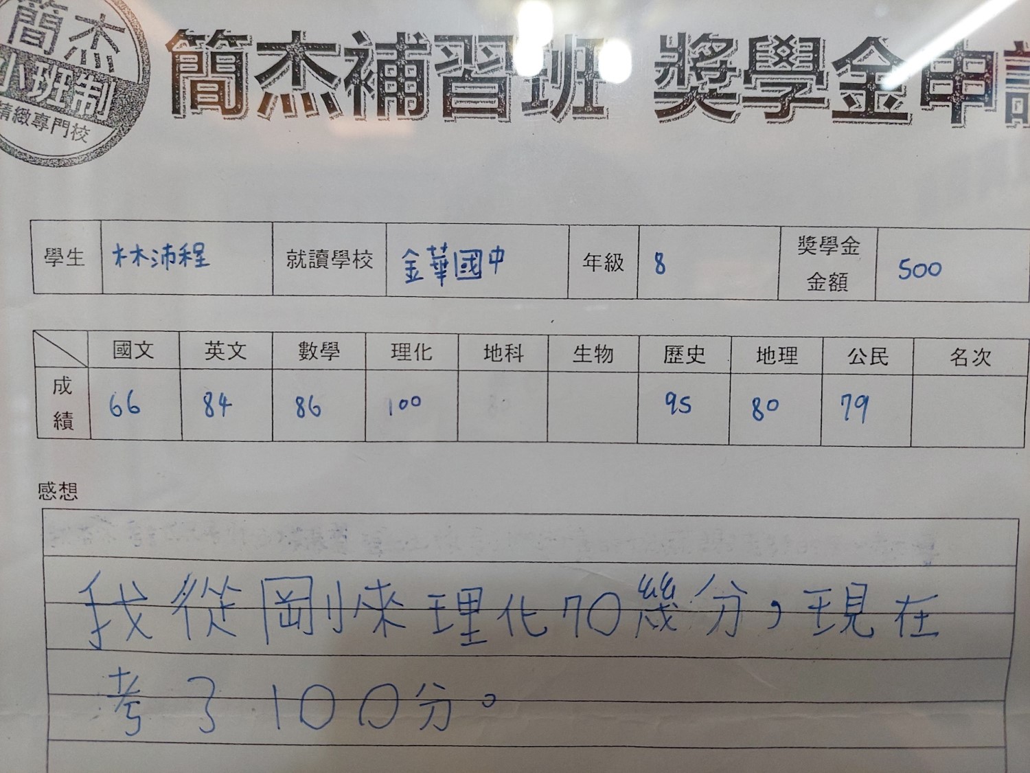 市立 金華國中 七年級 郭*甫 不理想~54 ~76~96分