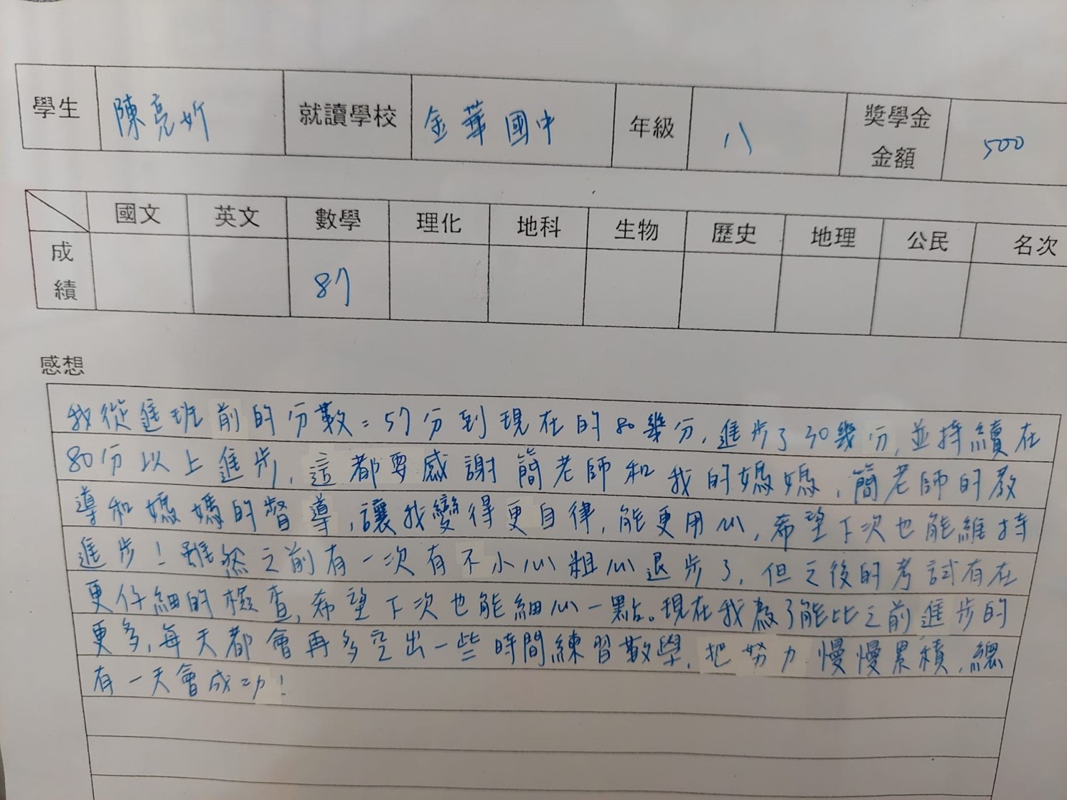 薇閣國中七年級 歐*姍 數 48→84 進步36分