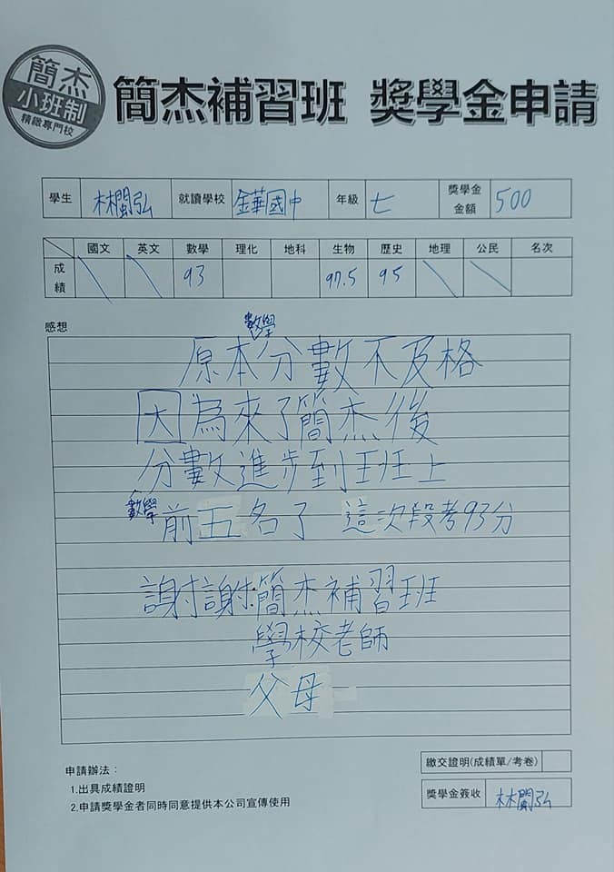 簡杰高年級課輔班 努力考上建中段考數學100分的開始