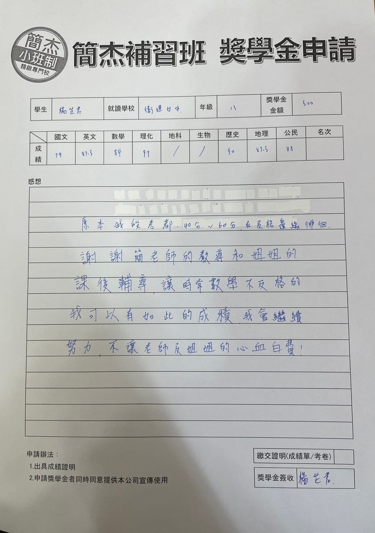楊同學 開來簡杰補習之前段考40-60分 簡杰補習之後超過80分或90分 高中成績 數學全班最高分 班排第二名 全校年級排前5名