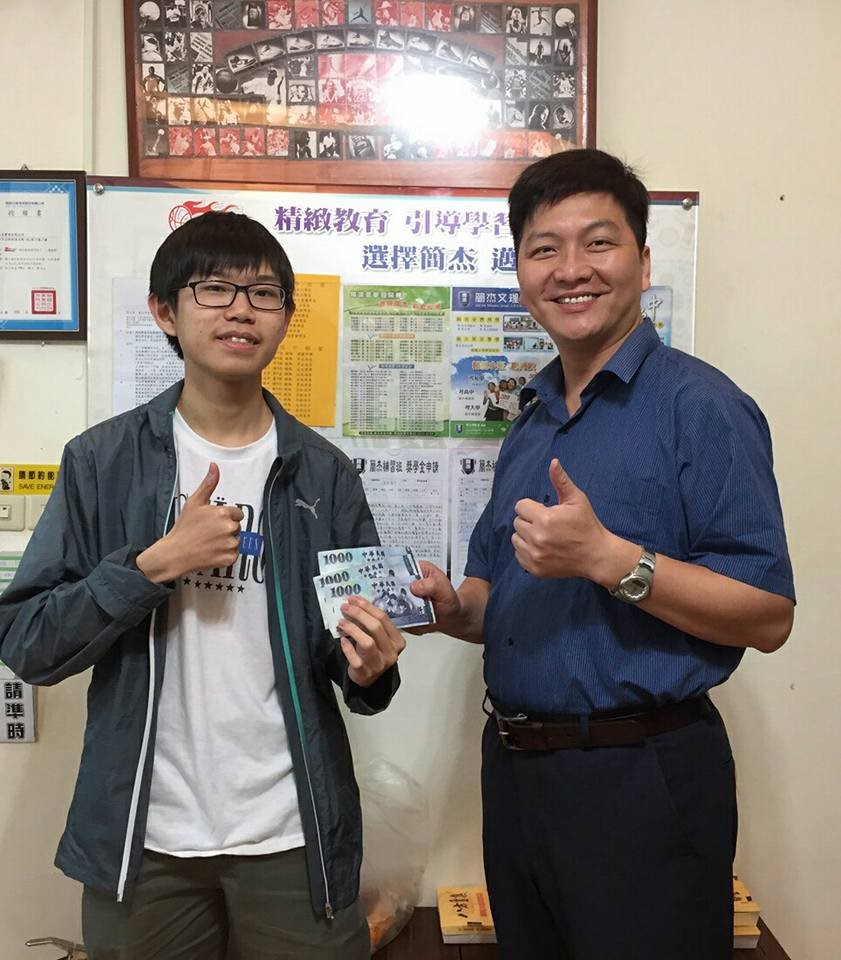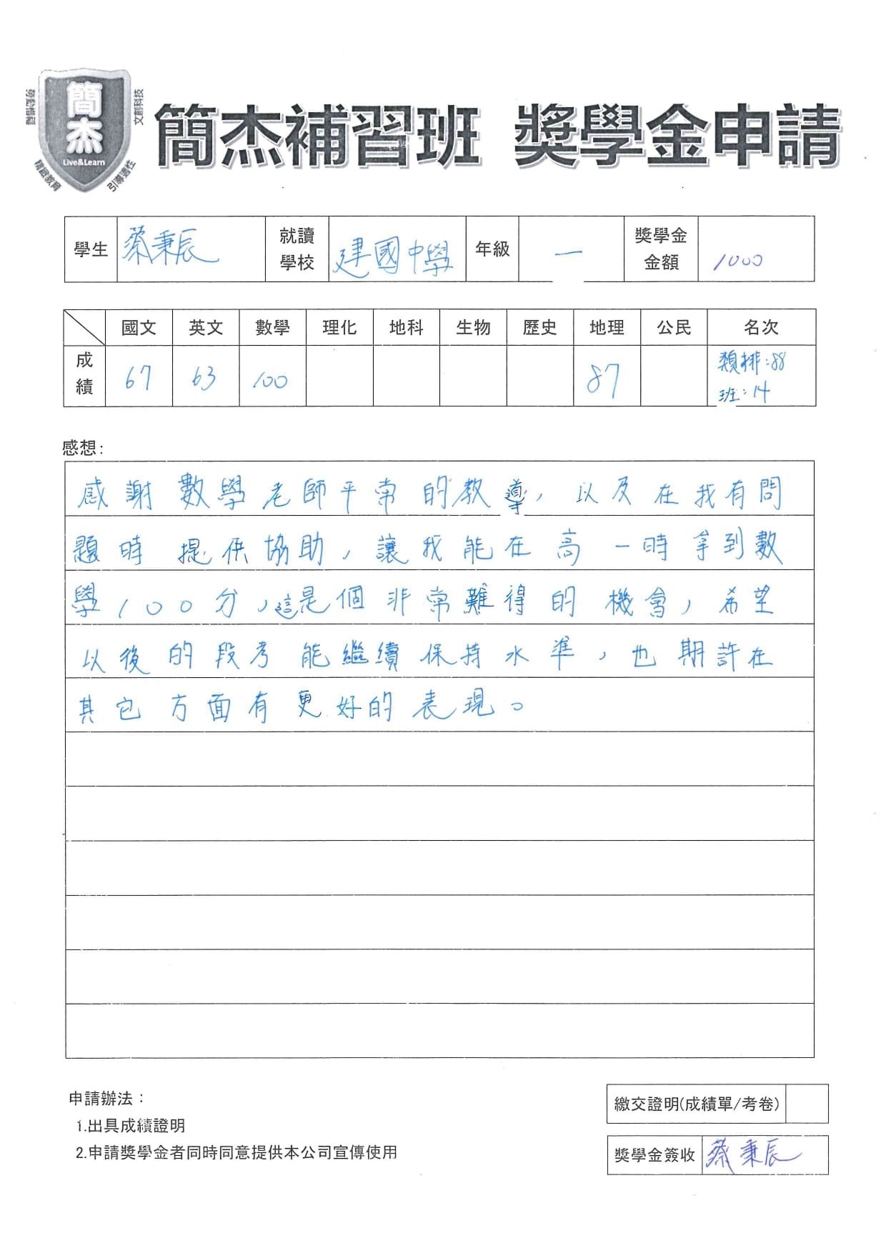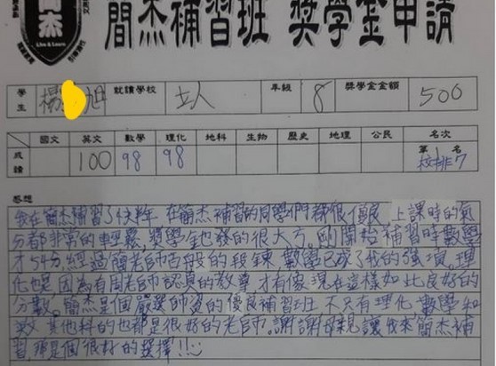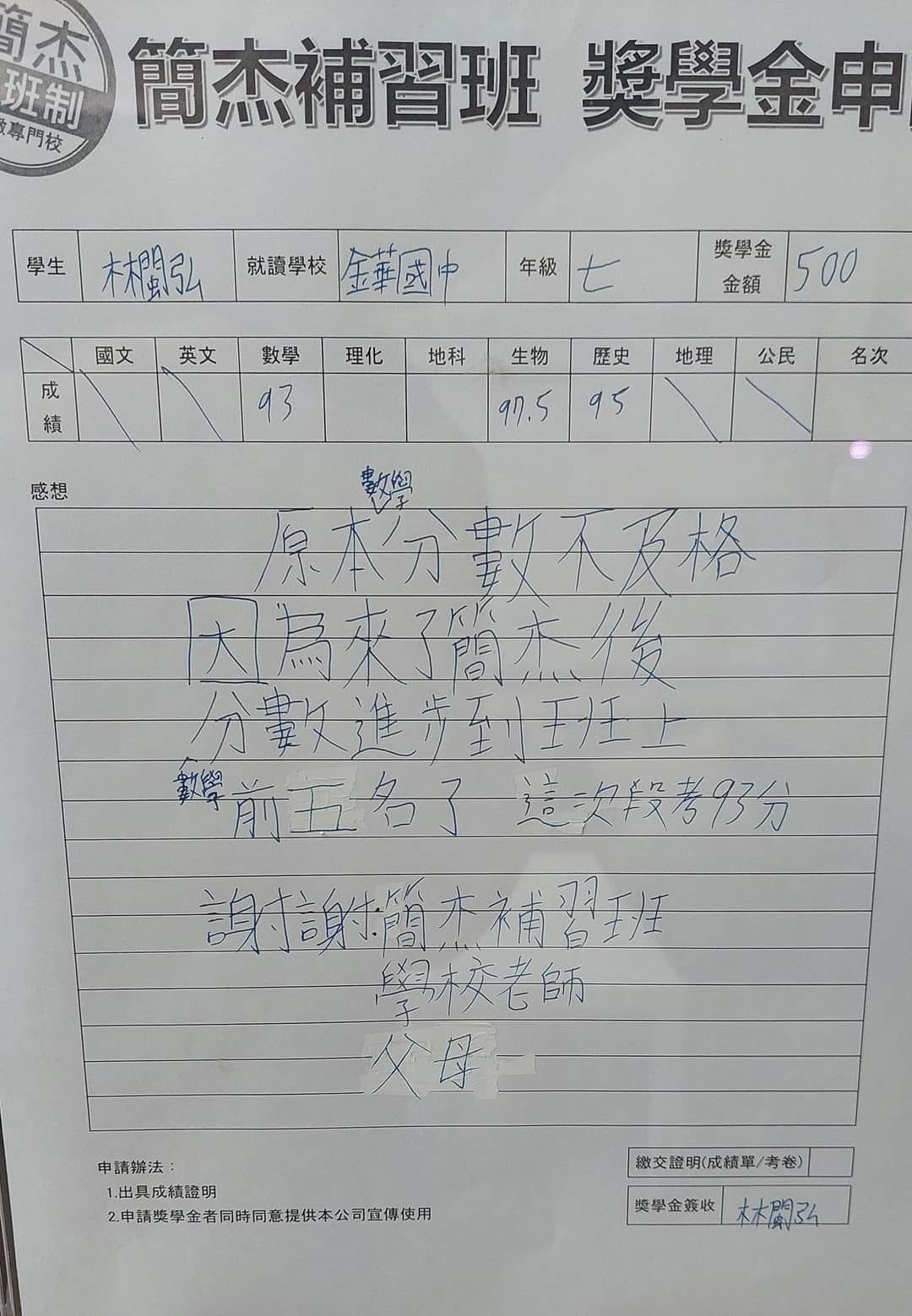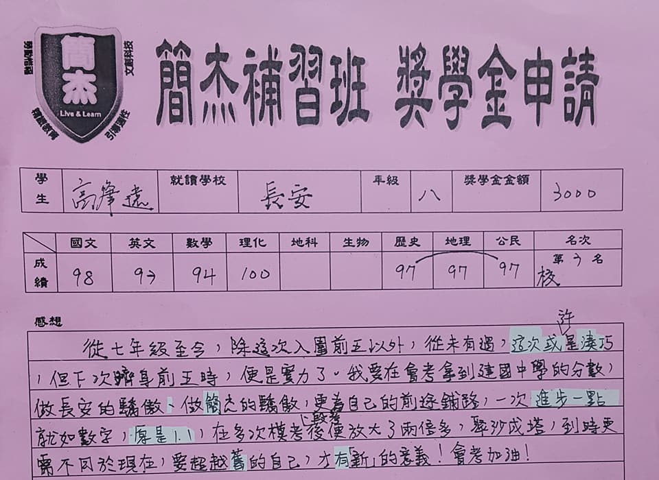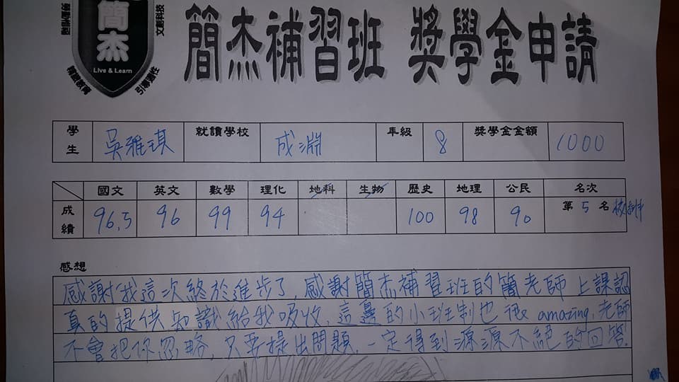 市立成淵中學 國九 周*崴史100分地98分 公94分