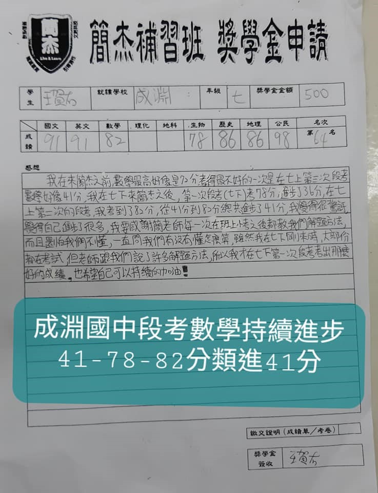 小六 大龍國小 陳宇渥 國文92 英文100 社會96 自然90 數72-89進步17分