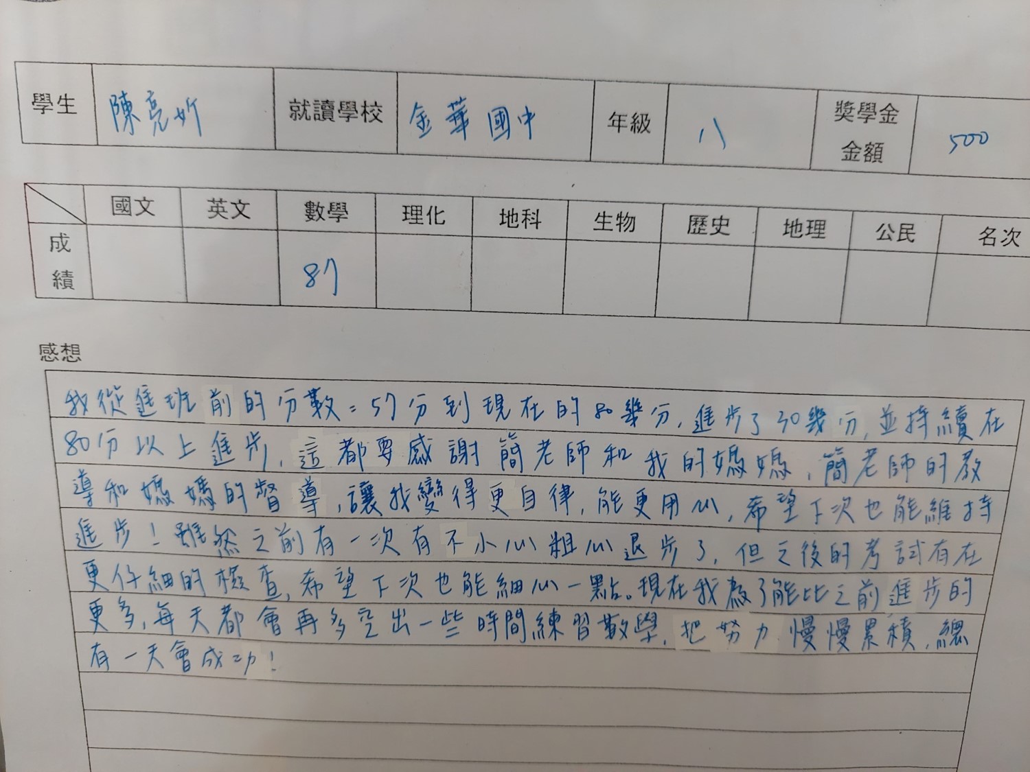小五 復興國小 林宥岑 社會100 自97 英66-81進步15分 數77-85進步8分
