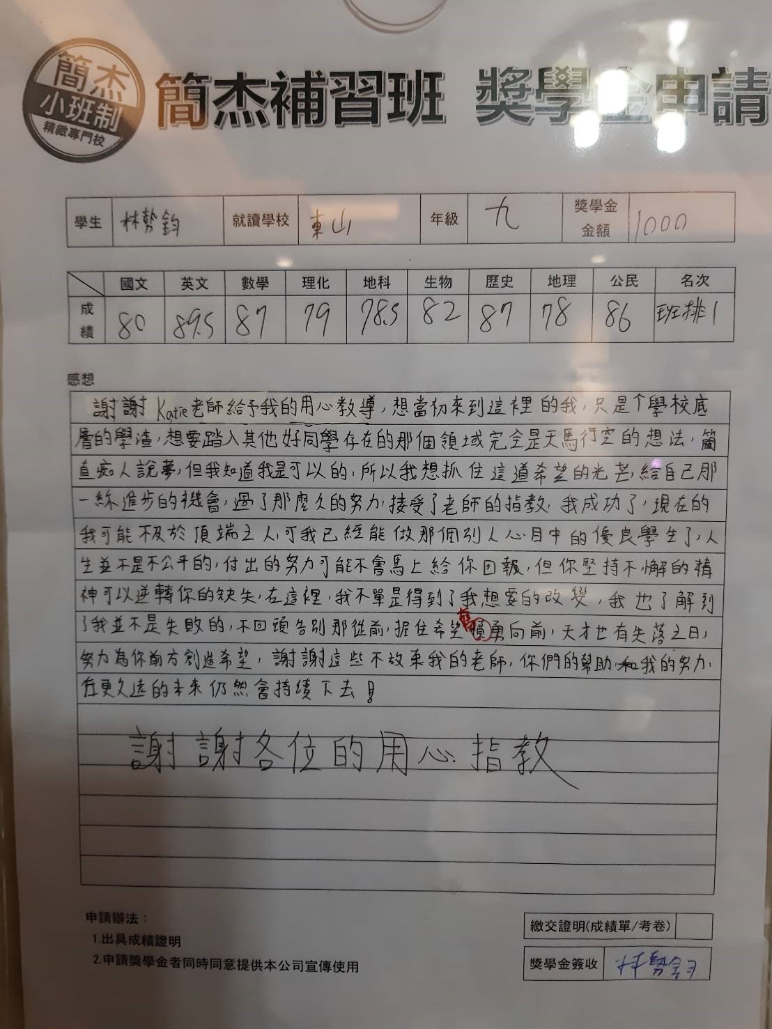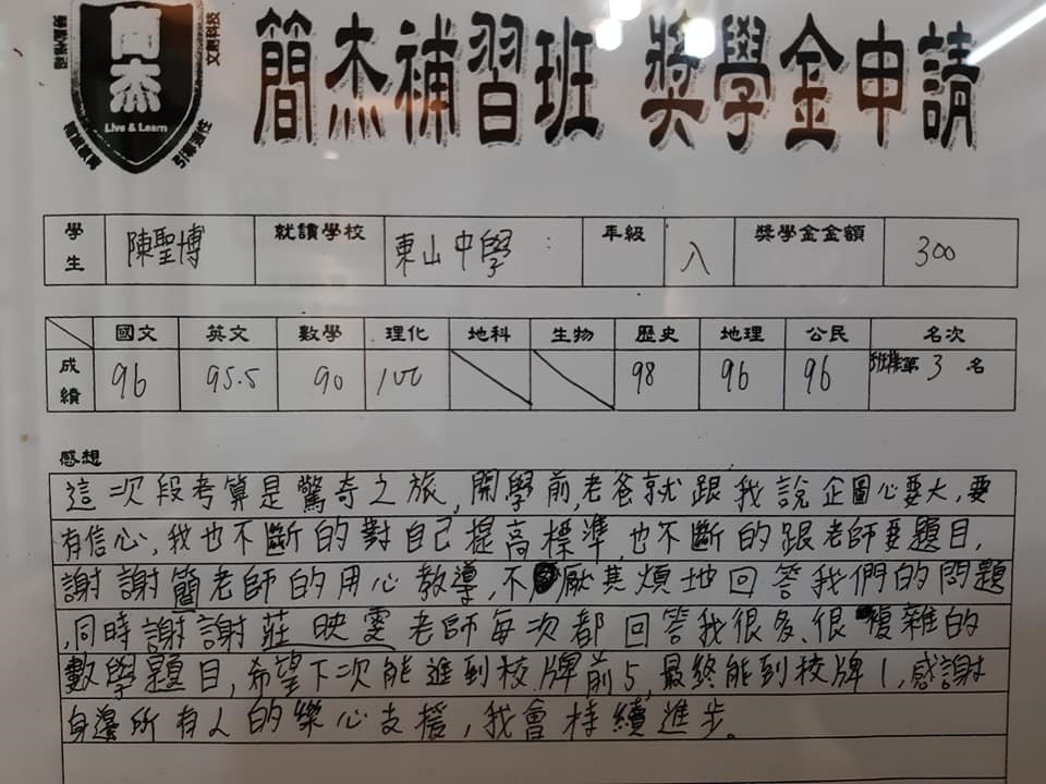 私立東山中學 國九 林*鈞 歷史96分 班排第二名